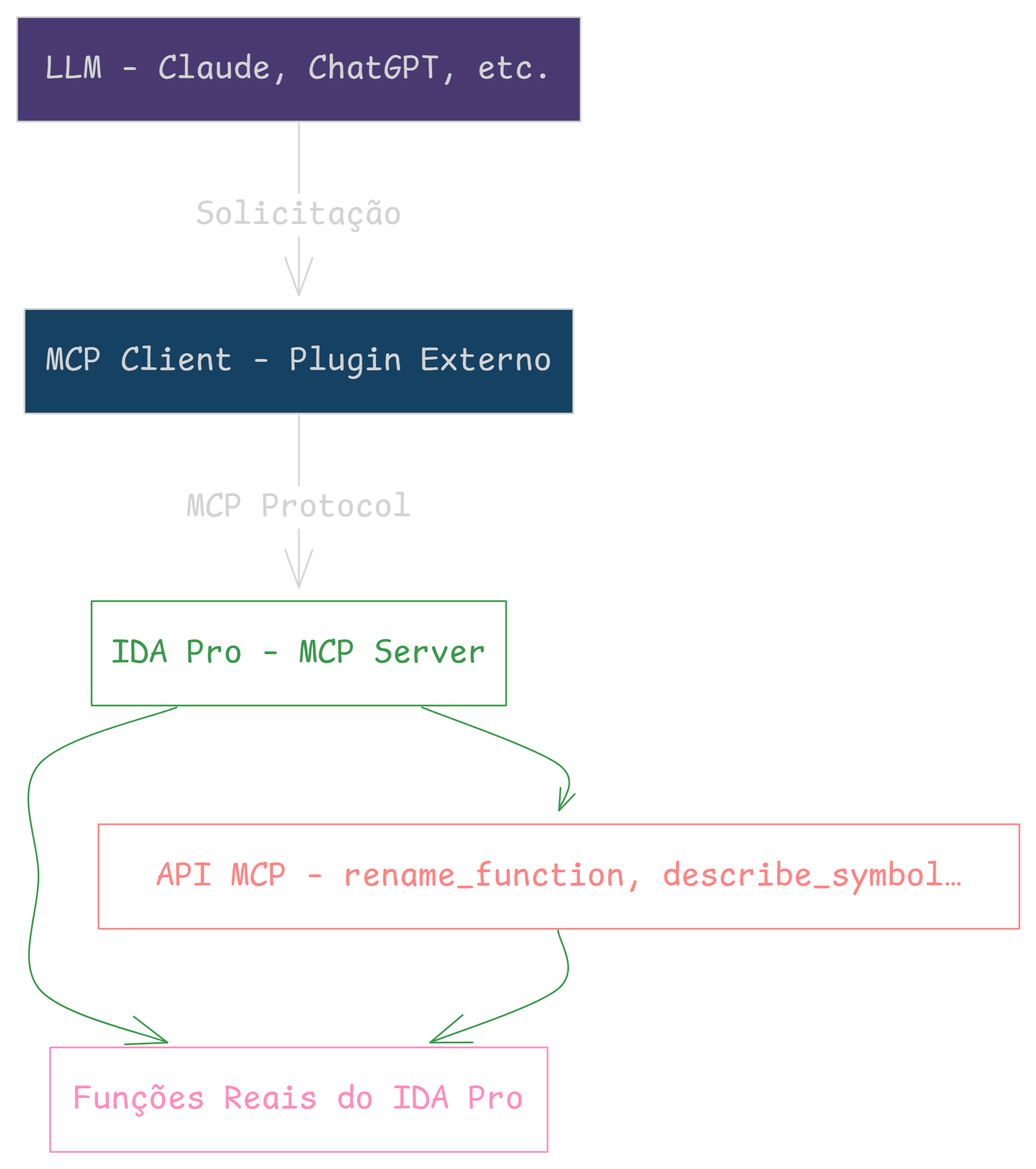 “O LLM recebe sua instrução em linguagem natural e envia ao MCP Client — no nosso caso, um plugin externo ao IDA Pro.”
